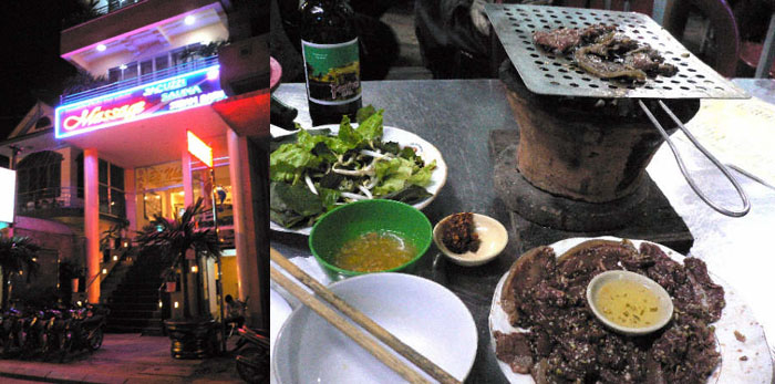 フエのトロピカル ガーデン レストラン前の、サウナもあるらしいマッサージ店に、 値段を聞きに入る。 1時間100kドン(6-7ドル)とかなり高い。入る人なんているのかな?と思うが、中 はけっこう騒がしそう。とりあえず入ってみると、男の子が、このロッカーに荷物を 入れてと世話をしてくれる。まさか彼がマッサージをするのか?