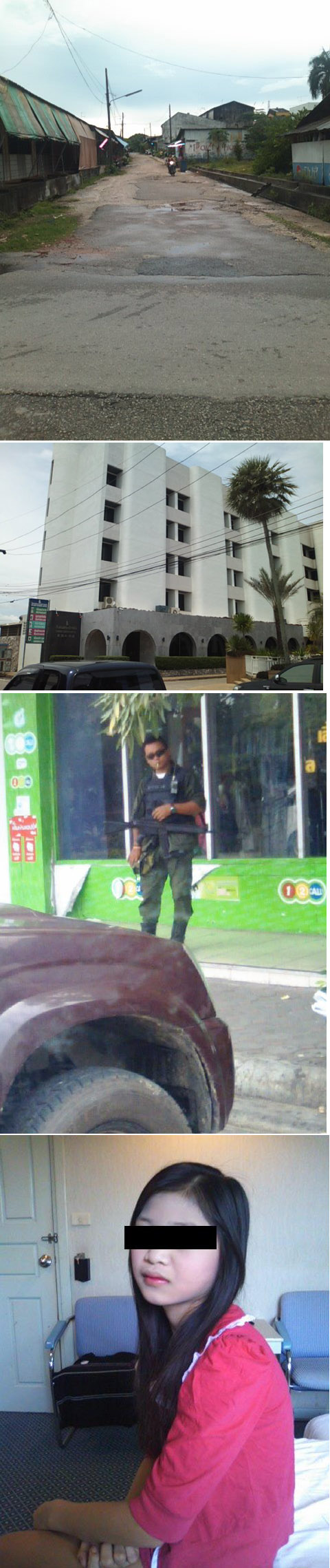 写真は泊ったGGホテル、ホテルの昼の裏路地、置屋の娘、コンビニの軍人。