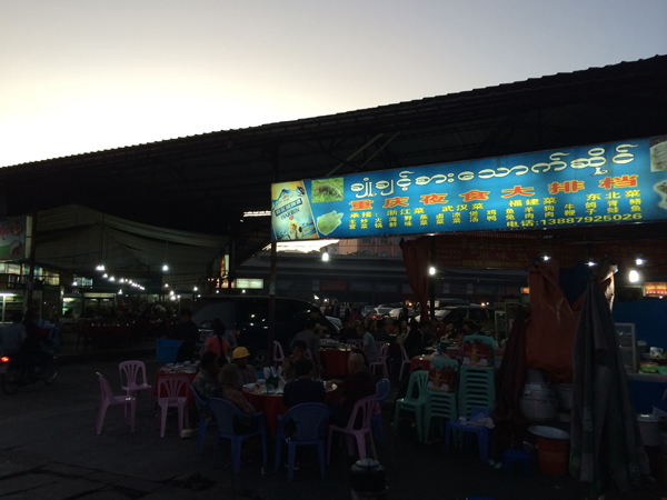 とっぷり日が暮れ、歩き疲れて街中央のマーケットへ。四川、雲南、福建、湖南などありとあらゆる中国の地方料理の屋台が揃っていながら、どういうわけかご当地ミャンマー料理は一軒も見当たらない、中国人のための巨大市場兼フードコートです。