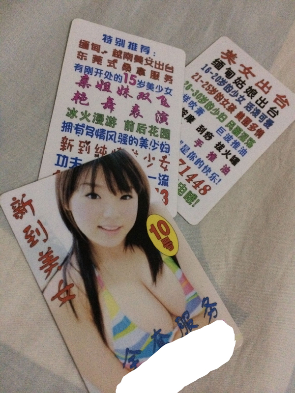 風俗嬢の名刺みたいなものなのだと思いますが、カードの写真は篠崎愛だったり小倉優子だったりと、こんなミャンマーの僻地においてもぶれのない中国クオリティ。
