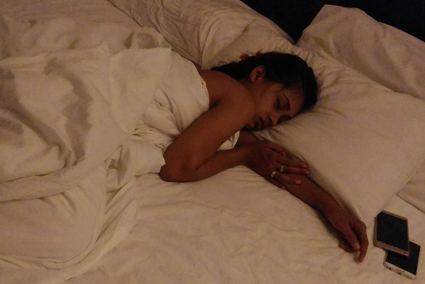 ヤンゴンGurlsが先にバスルームに入り出てきたらどちらもバスタオルを巻いて登場。3人でベッドに寝転がり記念撮影(右:WayWay,左:NweNwe)。
