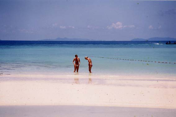 ピーピー島の移動は、ほとんどボートタクシーに依存している。アコモは島の北の先端のバンガロー。まわりも風俗度0%。(まあ愚息ともども休息にきたのだ) と自分にいいきかせる。シュノーケルダイブをしに近くの島までボートタクシーでゆく。すばらしく静かで綺麗なビーチに満足していると。