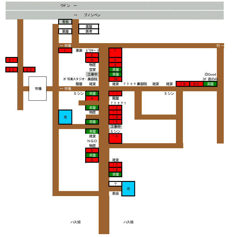 地球の遊び方 海外風俗体験記 カンボジア スワイパー村 第320回 S村地図2000年版 by hcup こんにちは、「hcup」と申します。 お世話になっております。 このGWに幻の国に修行に行って参りました。 今回、S村の店番号が新しくなっていました。 そこで第189回「刹那さん」の地図をもとに、 「S村地図2000年版」を作成しましたので投稿させていただきます。 これからもよろしくお願いいたします。 みんなの海外風俗体験記を募集中です!投稿は こちら!から