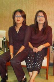 すぐ入口近くに,細身の娘とやや太めの娘の二人連れが微笑んでいるので,隣に座って話す.友達同士で昼は洋裁関係の仕事をしている Riちゃん23歳とRuちゃん27歳(写真)とのこと.1人1500Bとのことだったが,3Pも経験かと,二人まとめて2500BでOKしてもらう.