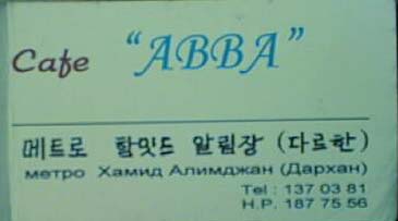 ウズベキスタンは、昨年末に2ヶ月程いたのですが、おもいっきりはまりました。 お店の名前は、ABBAです。場所は,首都のタシュケントの新市街です。 (名刺を添付します。)