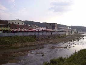 早速、噂の置屋を探そうと町を探索、町並みはハッキリ言って田舎町です。しかし派手な衣装を売っている店が何件かあり雰囲気はソウルの588です。町にある薬局で友人から頼まれていた早漏防止スプレーを購入。その店で置屋の場所を確認したのが、下の写真です。 川沿いにバリケードしてあるのはミヤリ同様、風紀の問題対策のようです。