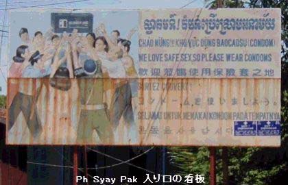 そこから更に2.4km北上すると左手にスワイパー村入り口の「コンドームを使いましょ う」看板があらわれます。