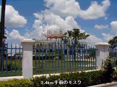 中央分離帯が終わってから2.2km行くと左手にレーダードームのような形を持ったモス クがあらわれます。普通のモスクは屋根の上に直接タマネギが乗っているのですが、こ のモスクは屋上にあるトラス構造のフレームの上に真ん丸のタマネギが乗っているとい う特徴的な形をしています。