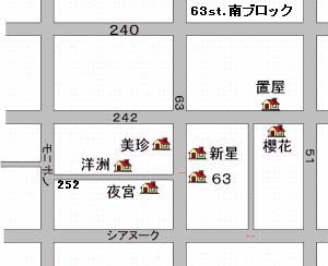 新光星の並びで、T字交差点になっている63stと252Ave.の交差点の東正面に按摩旅館 63があります。 金魚鉢も無く対面のお見合い形式でお嬢さん達を選ぶのですが、お嬢さん達に取り囲ま れて値踏みをされるのがこちら側という感じになってしまいます。女性の数も多くはあ りませんがフレンドリーです。